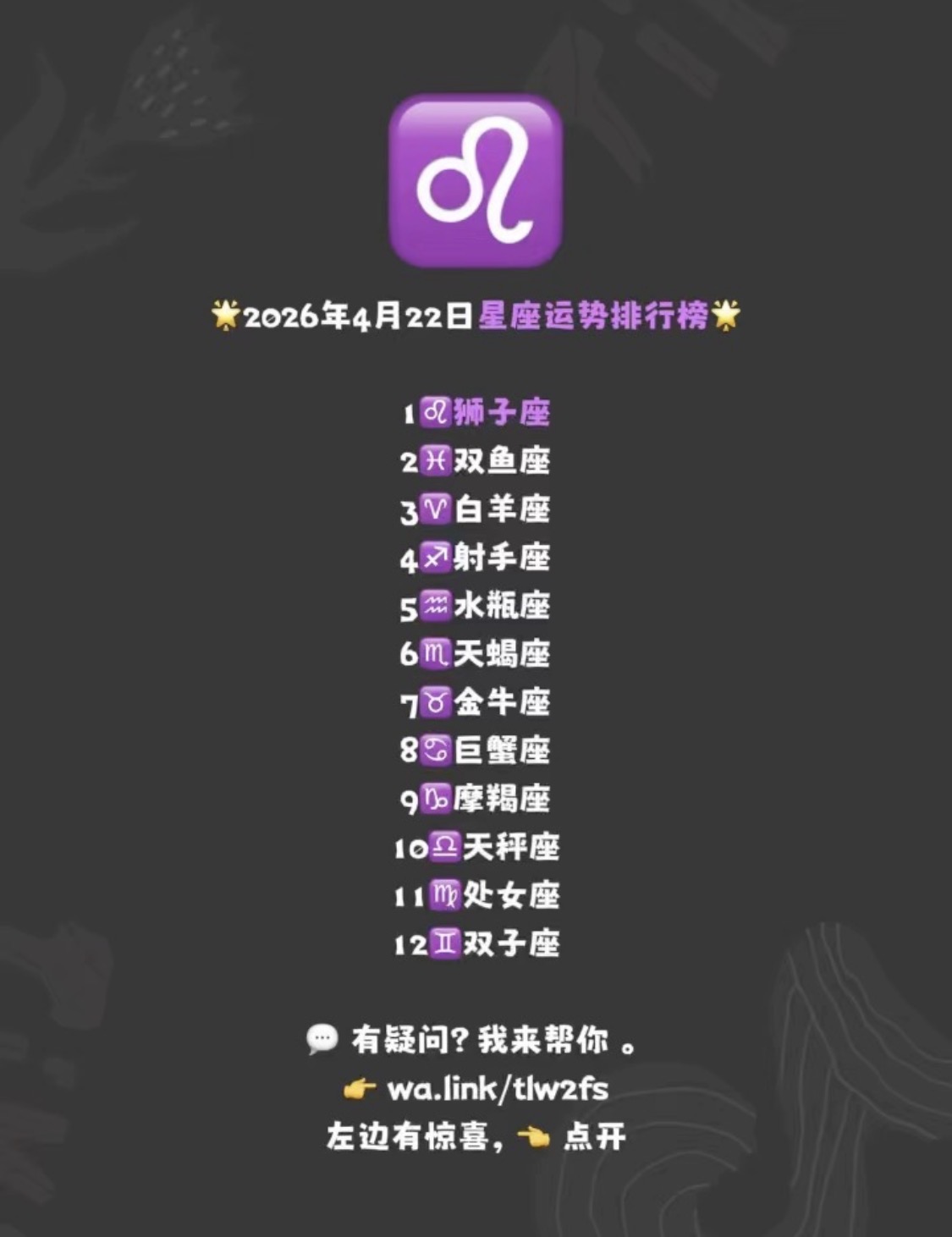 2026年4月22日星座排行榜: